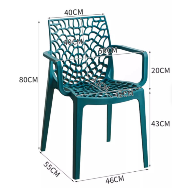 Fabricada íntegramente en polipropileno de alta calidad, ofrece gran resistencia y durabilidad, soportando hasta 150 kg. Sus medidas —60 cm de ancho, 80 cm de alto y 60 cm de profundidad— brindan una estructura cómoda y estable, con una altura de asiento de 45 cm que favorece una postura relajada y natural.